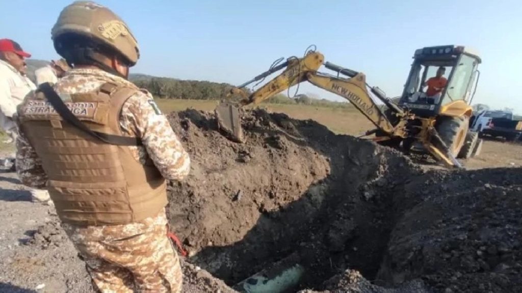 [Image showing a specialized Pemex task force and National Guard sealing a clandestine tap in a rural field]