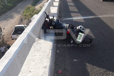 Fuerte accidente se registró esta tarde sobre el puente Ameca entre una motocicleta y un vehículo, donde resultó con lesiones delicadas el conductor de la moto, quien fue arrojado al momento de ser impactado, mismo que cayó al vacío de al menos 9 metros, quedando seriamente herido en la planta baja, donde fue auxiliado por elementos de los servicios de emergencias, quienes lo llevaron a recibir atención médica al IMMS de Mezcales y de ahí fue trasladado a otro hospital.