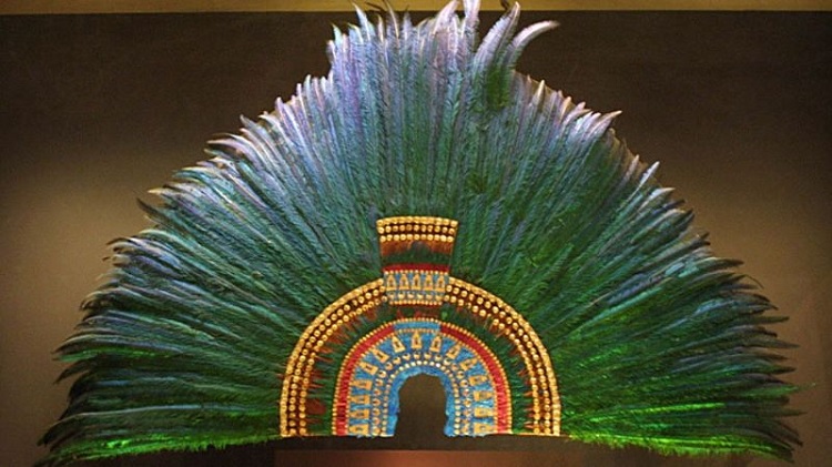 Es un quetzalapanecáyotl o tocado de plumas engarzadas en oro que perteneció al tlatoani Moctezuma Xocoyotzin (1466-1520)