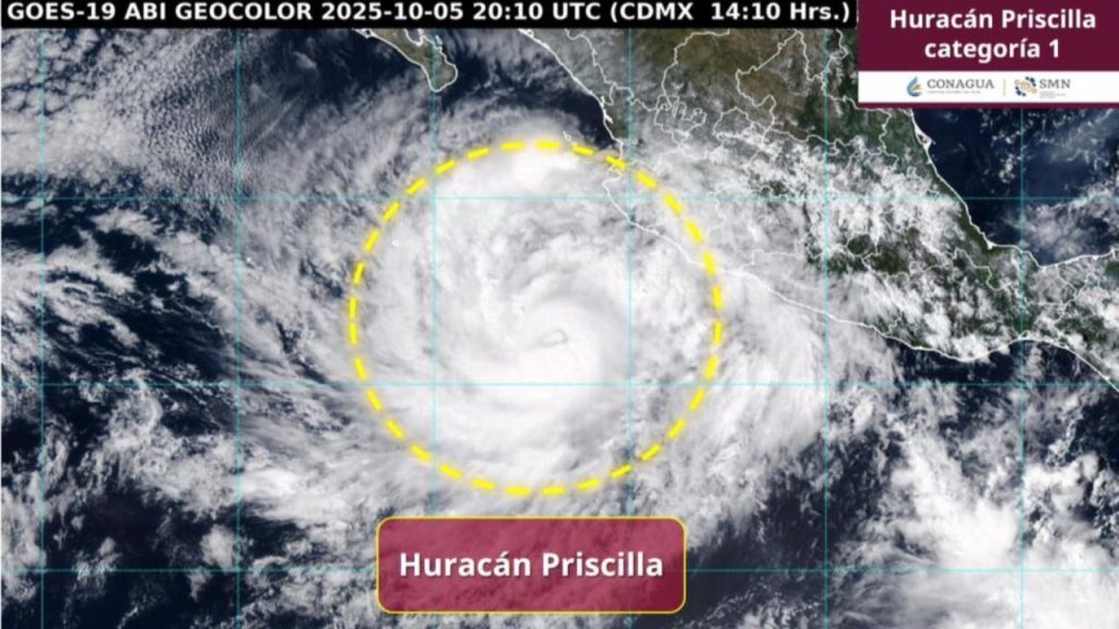 De acuerdo con el más reciente informe del Servicio Meteorológico Nacional (SMN), el huracán Priscilla presenta vientos sostenidos de 120 km/h y rachas de hasta 150 km/h, desplazándose hacia el nor-noroeste a 6 km/h. Se mantiene una zona de vigilancia por efectos de tormenta tropical desde Punta San Telmo, Michoacán, hasta Punta Mita, Nayarit, con oleaje de hasta 5 metros en costas de Jalisco, Colima y Michoacán.