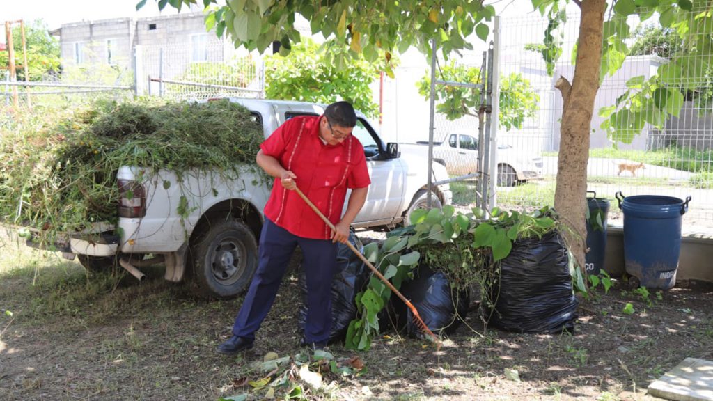 “Por el momento no hay actividad presencial en las escuelas por la pandemia, sin embargo la instrucción del presidente Jaime Cuevas Tello, es clara en cuanto a la continuidad de los diferentes programas que generen bienestar de la población, como en este caso el Programa Escuela Limpia y el Mantenimiento de Espacios Públicos”, informó Carlos Virgen Fletes, director de Desarrollo y Bienestar Social.