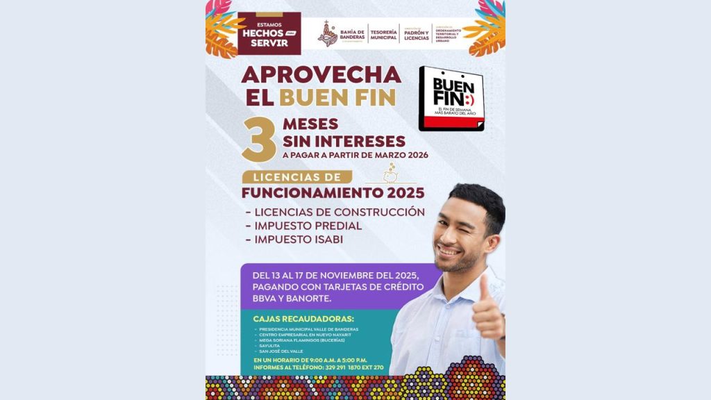 El H. XII Ayuntamiento de Bahía de Banderas anunció el inicio de una campaña especial con motivo del Buen Fin, diseñada para apoyar a la ciudadanía en la actualización de trámites y contribuciones municipales. La iniciativa, impulsada por la Tesorería Municipal y la Dirección de Padrón y Licencias, busca facilitar el pago de licencias e impuestos mediante un esquema de 3 meses sin intereses, disponible únicamente para pagos realizados con tarjetas de crédito BBVA y Banorte.