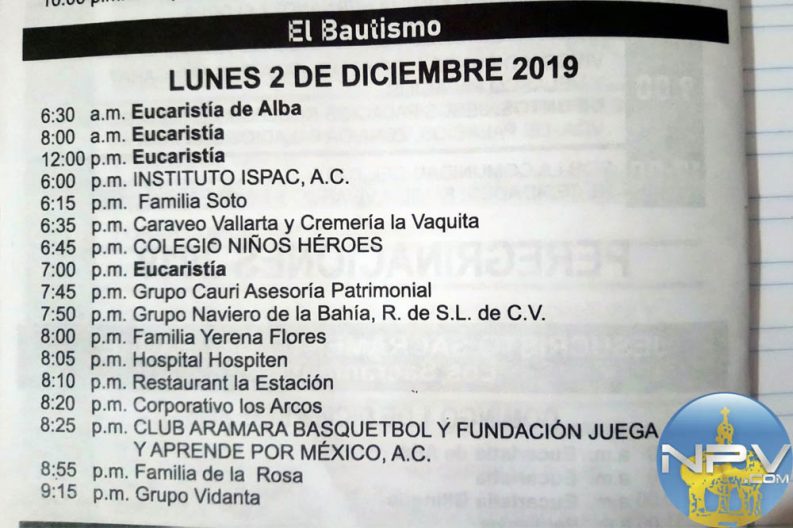 En este martes 2 de diciembre y como el resto de los días hasta el 11 de diciembre, desde las 5 y 6 de la tarde estarán llegando peregrinaciones representativas de diversos centros de trabajo, escuelas, empresas hoteleras, restauranteras, talleres, asociaciones civiles, sindicatos y familias completas, entre otros. En este día, desde Bahía de Banderas, también habrá varias peregrinaciones están programados para arribar a la parroquia de Nuestra Señora de Guadalupe a las 10 de la noche.