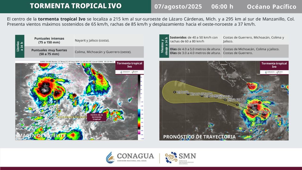 La tormenta tropical Ivo continúa su desplazamiento frente a las costas del Pacífico central mexicano, generando condiciones meteorológicas adversas para los estados de Jalisco y Nayarit. De acuerdo con el Servicio Meteorológico Nacional (SMN), el sistema se localizaba este jueves a 215 kilómetros al sur-suroeste de Lázaro Cárdenas, Michoacán, con vientos sostenidos de 65 km/h, rachas de 85 km/h y un desplazamiento hacia el oeste-noroeste a 37 km/h.