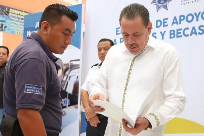 Así lo expresó el doctor Jaime Cuevas Tello, Presidente Municipal de Bahía de Banderas, durante el evento de entrega de apoyos de FORTASEG, en el «Programa de Mejora de las Condiciones Laborales», a través del cual se entregó a 215 elementos de la Dirección de Seguridad Pública y Tránsito, recursos económicos para la construcción o remodelación de vivienda, así como becas para hijos y cónyuge o concubinas de policías, por un monto superior al millón y medio de pesos.