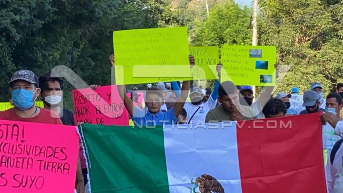 Los manifestantes pacíficos demandaron la presencia de autoridades de los tres niveles de gobierno, a efecto de que les expliquen acerca de la situación de este espigón, construido en la playa, frente a los arcos de Mismaloya, lugar ampliamente visitados por turistas, zona que está protegida por las propias autoridades.