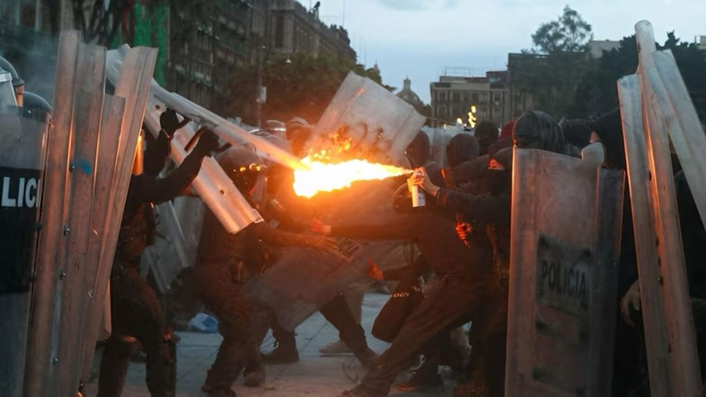 En el Zócalo se reportaron enfrentamientos entre encapuchados y policías de la Ciudad de México, en las calles de Francisco I. Madero, 16 de Septiembre y 5 de Mayo, pues los embozados lanzaron objetos a la autoridad, y los agentes intentaron encapsularlos con extintores para repelerlos.