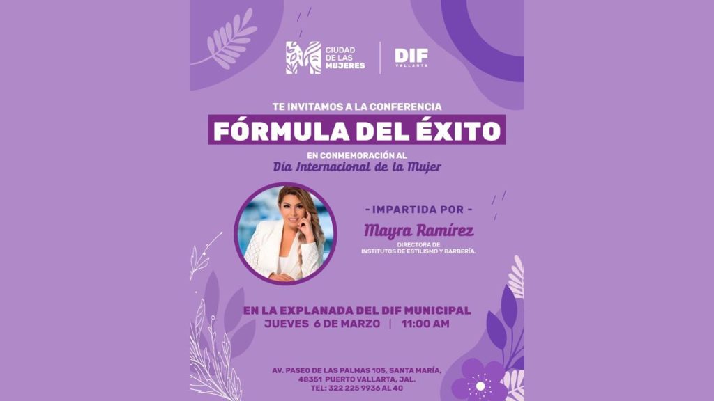 Con motivo de la conmemoración del día internacional de la mujer del 08 de marzo, el Sistema para el Desarrollo Integral de la Familia de Puerto Vallarta que preside Claudia Peña Gómez, invita a mujeres y público en general a la charla “fórmula del éxito”.
