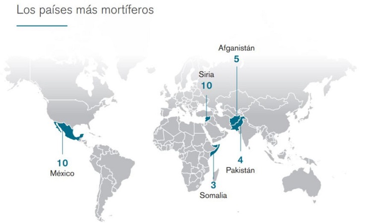 El documento, que registra las agresiones a la prensa del 1 de enero al 1 de diciembre de 2019, destaca que, de los 49 asesinatos a periodistas, 29 (59%) ocurrieron en zonas de paz, y 10 de ellos en México, que mantuvo el mismo número de comunicadores ejecutados que el año anterior.