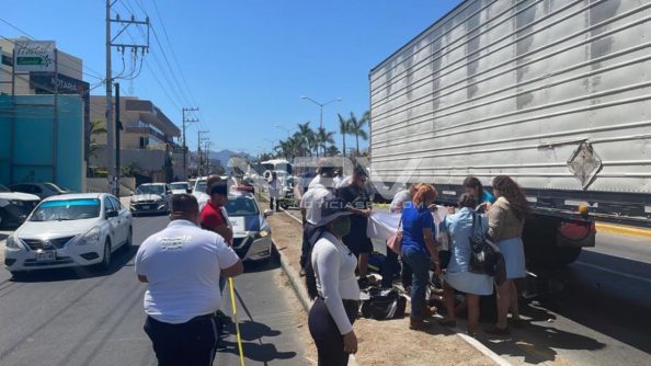 El accidente se dio sobre el boulevard Riviera Nayarit *El joven de la moto iba rebasando entre los vehículos, pero se cayó y quedó debajo de la caja de un trailer en circulación *Fue arrastrado más de 30 metros y tuvo que ser llevado a un hospital