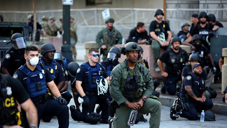 El Departamento de Policía de Santa Cruz, también en California, publicó en Twitter una foto de dos de sus agentes arrodillados junto a los manifestantes, con un mensaje en el que expresa que el cuerpo «apoya plenamente las protestas pacíficas». En Minesota, un soldado de la Guardia Nacional también se dirigió a los manifestantes arrodillado fuera del Capitolio en la capital del estado, Saint Paul.
