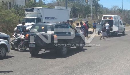Al sitio indicado se dirigieron los elementos de Protección Civil del Estado, con base regional en Rincón de Guayabitos, a bordo de las unidades a cargo del paramédico Antonio Meza Uribe, quienes al arribar al lugar se dan cuenta que se trata efectivamente de un accidente entre una motocicleta y una camioneta, teniendo a la vista a un masculino lesionado, quien estaba tirado en la carpeta asfáltica.