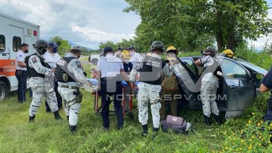 Al sitio indicado arribaron los oficiales de la policía vial, a bordo de sus unidades a cargo del comandante Samuel Osorio Santos, quienes informan que ahí ya se encuentra personal de la Guardia Nacional, resguardando el área y a una mujer que resultó lesionada, arribando también los paramédicos y bomberos de Protección Civil Municipal, para auxiliar a la fémina que se apreciaba atorada de sus pies.
