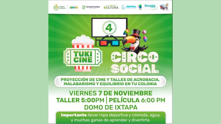 El Gobierno de Puerto Vallarta llevará a cabo este viernes 7 de noviembre la primera edición del programa TukiCine, con actividades culturales, talleres y proyección de cine en el Domo de Ixtapa.