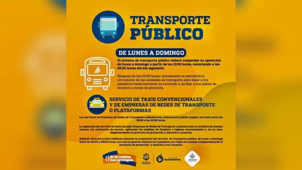 De lunes a domingo, el sistema de transporte público deberá suspender su operación de lunes a domingo, a partir de las 21:59 horas, reiniciándose a las 5:30 horas del día siguiente.