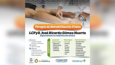 Con el propósito de proporcionar servicios especializados en terapia de rehabilitación física y muscular, el Gobierno de Puerto Vallarta, a través del Consejo Municipal del Deporte (Comude) y la empresa Ekilibrar-t ponen a disposición de la comunidad deportiva y público en general, el servicio de rehabilitación física en lesiones deportivas, patologías clínicas y tratamientos.