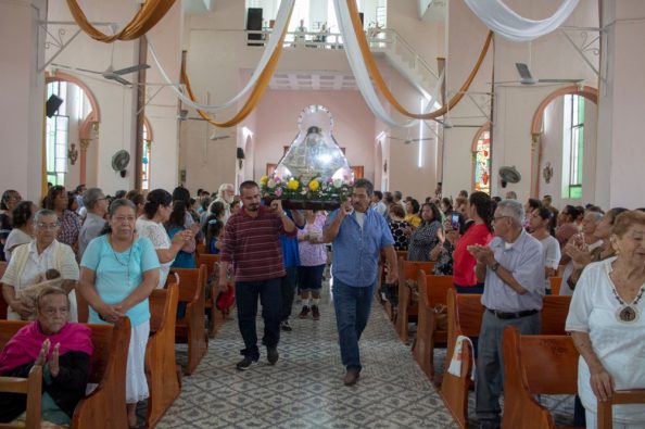 Entre brechas, cultivos y canales de riego, alrededor de más de 200 feligreses de San Juan de Abajo, en peregrinación salen de su comunidad para ir a celebrar a Nuestra del Rosario del Tintoque, patrona de Valle de Banderas, Bahía de Banderas, Nayarit. Por turnos, los varones portan en hombros a la Virgen Peregrina durante alrededor de 3 horas que dura el trayecto