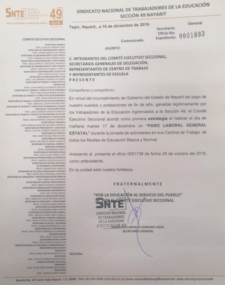 Acuerdos incumplidos por parte de las secretarías de Salud y Educación ante la dirigencia sindical y una postura de displicencia y desdén por parte del gobernador de Nayarit, Antonio Echevarría García, los trabajadores sindicalizados paralizaron el centro de la capital, por parte del sector educativo hubo paro general este martes 17 de diciembre 2019.