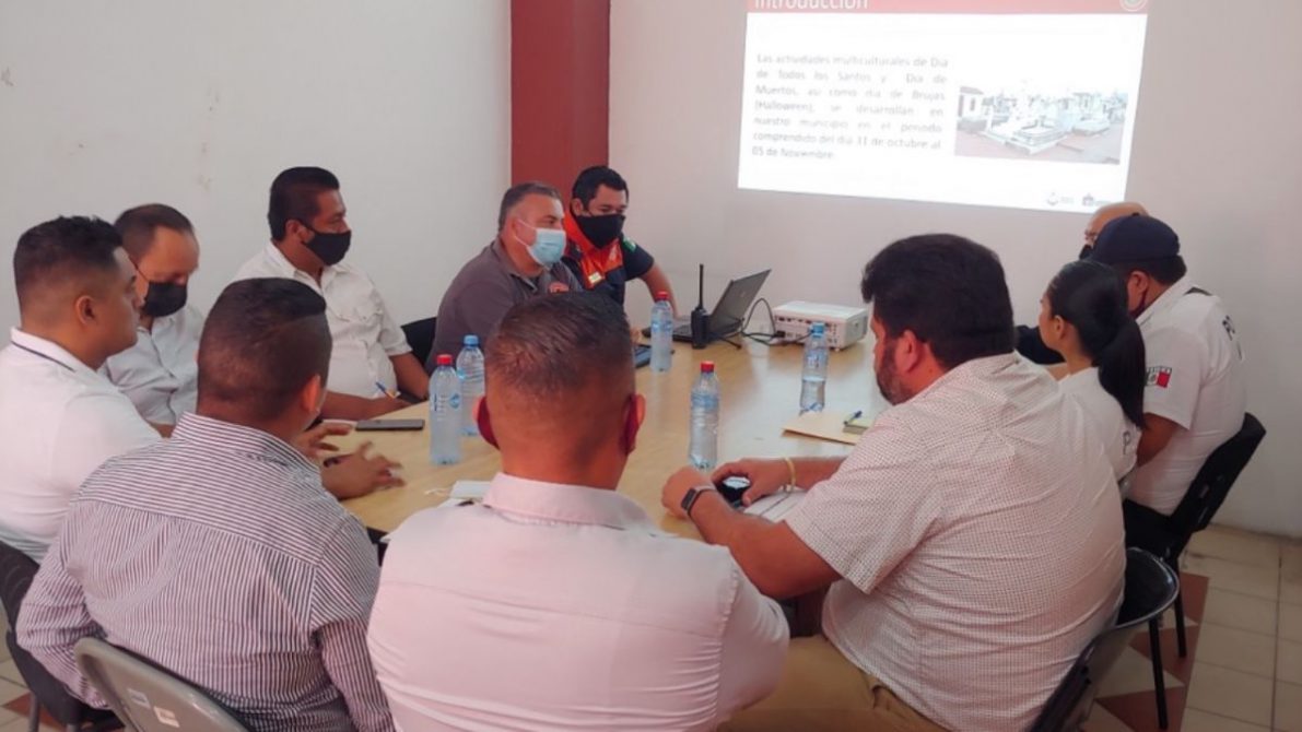 Con el fin de coordinar acciones que permitan garantizar la seguridad e integridad física de las personas, autoridades de Protección Civil y Bomberos de Puerto Vallarta (PCyB), sostuvieron una reunión con las distintas áreas operativas y de seguridad del Ayuntamiento, para la presentación del ‘Plan Operativo Día de Muertos 2021’, el cual contempla las recomendaciones y medidas sanitarias establecidas por la Mesa de Salud para la prevención del Covid-19.