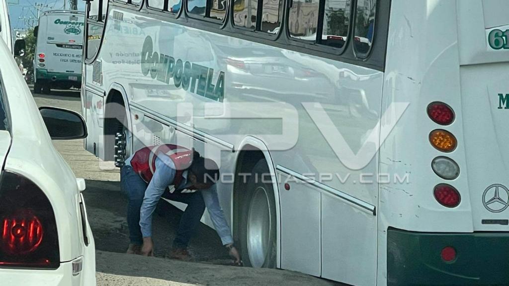 Los baches son tan profundos que como trampas caen sobre ellos vehículos tan grandes como un camion urbano que quedó atorado en uno de ellos.