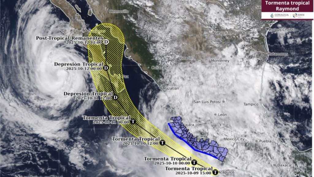 De acuerdo con el reporte más reciente del Servicio Meteorológico Nacional (SMN), Raymond se localiza aproximadamente a 135 kilómetros al sur de Zihuatanejo, Guerrero, y a 1,115 kilómetros al sur del extremo sur de la Península de Baja California. La tormenta presenta vientos sostenidos de 45 km/h, con rachas de hasta 75 km/h, y se desplaza hacia el oeste-noroeste a 24 km/h.