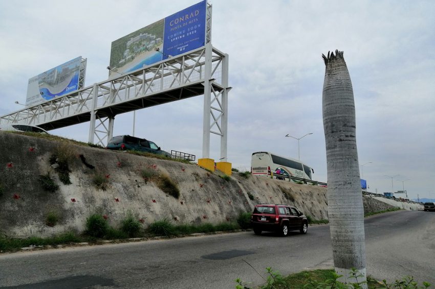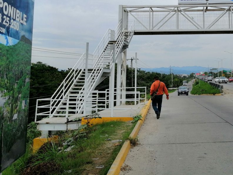 Desde hace casi 9 años este puente peatonal está inconcluso, la empresa publicitaria que firmó convenio con el Ayuntamiento de Bahía de Banderas, Nayarit, no cumplió, pero tampoco el gobierno municipal, los afectados son cientos de usuarios que diariamente cruzan sobre la carretera los 8 carriles para visitar la plaza comercial