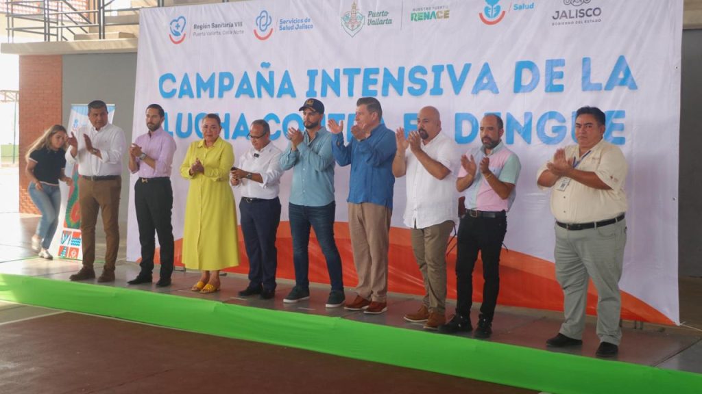 Con la participación de autoridades federales, estatales y municipales, Puerto Vallarta puso en marcha una estrategia integral para combatir el dengue. El evento fue encabezado por el alcalde Luis Munguía González y contó con la presencia del secretario de Salud de Jalisco, Dr. Héctor Raúl Pérez Gómez; el director general del OPD Servicios de Salud Jalisco, Dr. Héctor Hugo Bravo Hernández; así como representantes del IMSS, ISSSTE y otras instituciones del sector salud.