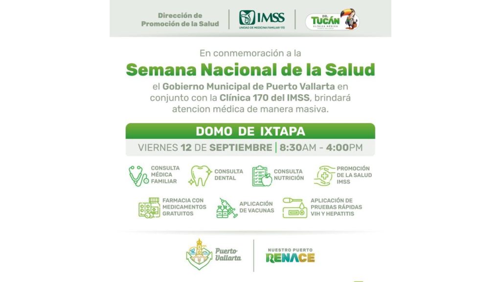En el marco de la Semana Nacional de la Salud, Puerto Vallarta vivirá una jornada masiva de atención médica gratuita este viernes 12 de septiembre en el domo de Ixtapa, de 8:30 de la mañana a 4:00 de la tarde, esto gracias a la suma de esfuerzos del gobierno de Luis Munguía González y la Clínica 170 del IMSS.