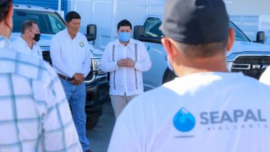 El director de SEAPAL Vallarta, Santiago Centeno Ulín y el alcalde interino de Puerto Vallarta, Jorge Quintero Alvarado, realizaron la entrega simbólica de vehículos y equipamiento a los que se destinó una inversión superior a los 34 millones de pesos, para fortalecer el trabajo operativo durante el primer año como organismo municipal.