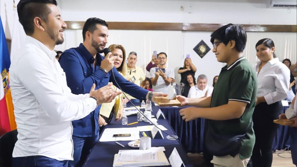 El alcalde Luis Munguía y la regidora Laurel Carrillo Ventura, presidenta de la Comisión de Cultura y Derechos Culturales, entregaron un reconocimiento a alumnos de la Escuela Secundaria Técnica 3, ETI, por su destacada participación en el Festival Inter Escolar de Cine en Puerto Vallarta, donde presentaron 27 cortometrajes grabados con celular que abordaron temas relevantes como la inclusión, familia, amistad, secuestro y drogadicción.