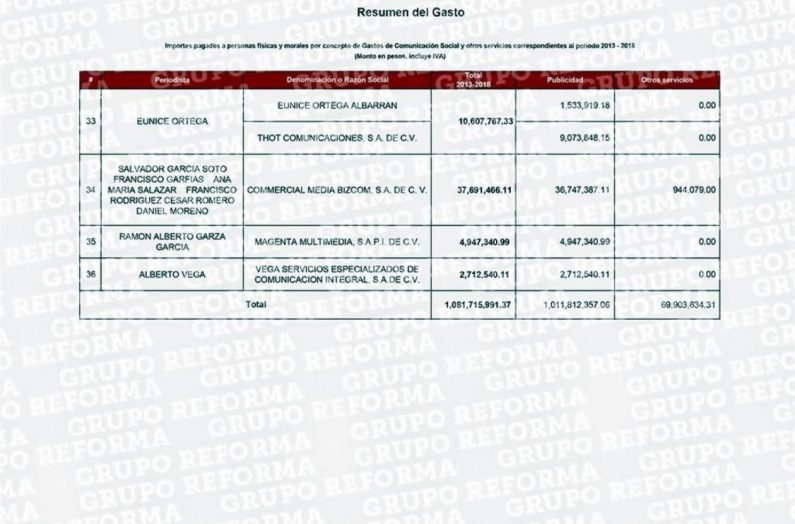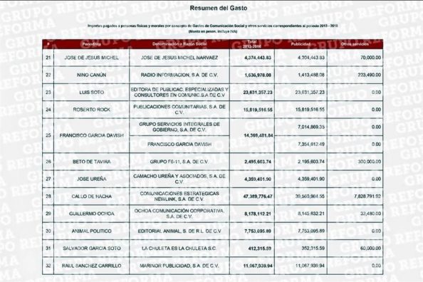Agrega: “En el listado revelado están además, Eunice Ortega por 10 millones 607 mil pesos; Maru Rojas, con 9 millones 554 mil 903 pesos; Guillermo Ochoa con 8 millones 178 mil; Francisco Cárdenas con 7 millones 853 mil 293; el portal Animal Político con 7 millones 753 mil; Eduardo Ruiz Healy con 4 millones 242 mil; y Nino Canún con 1 millón 636 mil pesos”.