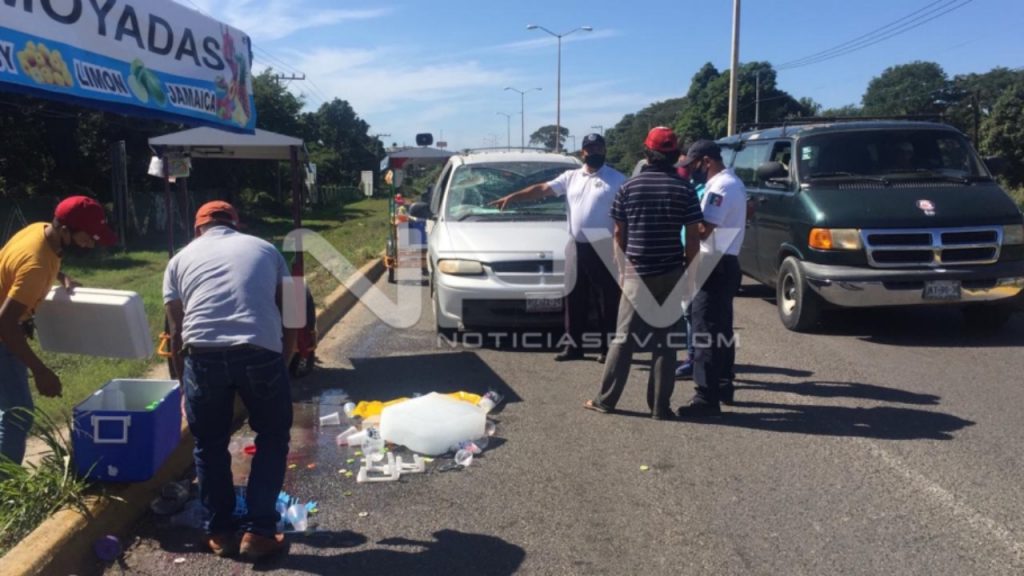 Aparatoso accidente se registro por la carretera Mezcales, donde una camioneta tipo familiar chocó contra un vendedor de raspados, quien afortunadamente no resultó con lesiones graves, aunque sí le causaron daños a su triciclo.