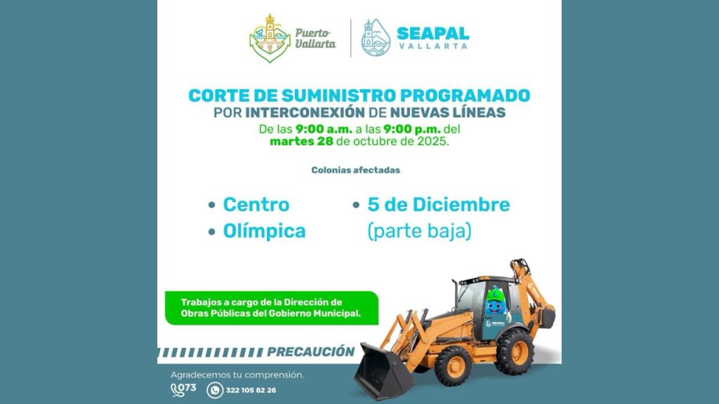 Por obras del Gobierno Municipal en la avenida México, Seapal Vallarta informó que suspenderá temporalmente el servicio de agua potable en las colonias Centro, 5 de Diciembre y Olímpica, de 9:00 a.m. a 9:00 p.m.