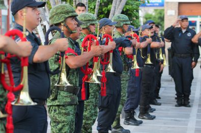 Tras izar la bandera a toda asta con motivo de esta fecha histórica, por parte de la escolta de la 41ª Zona Militar y los elementos de la Dirección de Seguridad Ciudadana, se realizó la entonación del himno nacional mexicano por parte del coro Voces de la Mar y la Banda Municipal, quienes exaltaron una a una las estrofas de este cantico nacional. Asimismo, alumnos de la Preparatoria Arkos participaron con la poesía ‘Suave Patria’, resaltando en sus palabras el orgullo de quienes formamos parte de esta nación.
