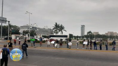 Manifestantes sin el uso de cubre bocas y de no guardar la sana distancia, salieron a la avenida de ingreso, a la altura de la Administración Portuaria Integral, API, para protestar en demanda de una pronta reactivación económica en Jalisco, detenida por la contingencia del Covid-19, que consideran es un engaño y manipulación gubernamental.