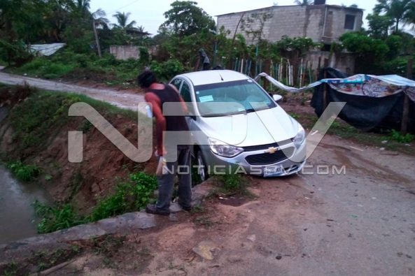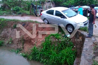 Taxi por poco y cae a un canal de desagüe pluvial luego de que derrapó con los neumáticos al circular por el acotamiento de la avenida de Rincón del Cielo en Mezcales.