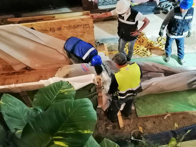 Posteriormente se realizó el proceso de colocación del rollo de fibra de vidrio, que en esta ocasión, tuvo mayor grado de dificultad dado que ya no existía parte del tubo, por lo que debieron implementar una solución con una “faja rígida”, para que la manga no perdiera la forma al adherirse a las paredes de la tubería existente al momento del inflado con aire presión.