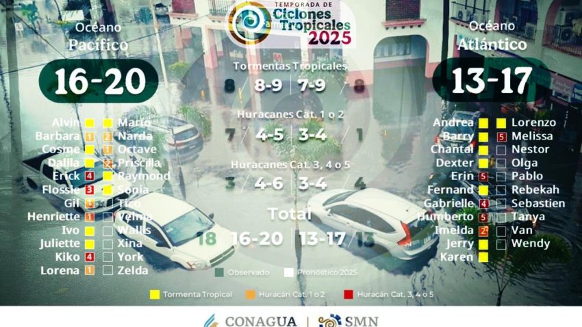 La Temporada de Lluvias y Ciclones Tropicales 2025 concluyó con una marcada actividad en el océano Pacífico, donde se registraron 18 ciclones tropicales, mientras que en el Atlántico se contabilizaron 13 sistemas, informó el Servicio Meteorológico Nacional (SMN) de la Conagua.