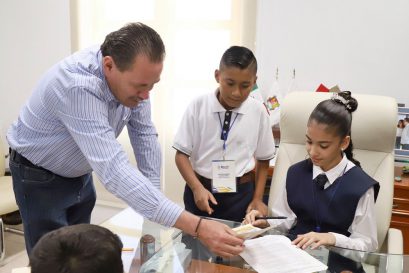 Por su parte, el Alcalde Jaime Cuevas Tello, acompañado por su esposa, la presidenta del DIF Municipal, L.T.S. Ana Esperanza Berumen de Cuevas y los regidores del Décimo Ayuntamiento, agradeció a la comunidad educativa el exitoso ejercicio democrático con el cual fueron seleccionados los niños y niñas del gabinete, regidores y presidente municipal, “en el éxito de este ejercicio está el esfuerzo y empeño de todos ustedes”, señaló.