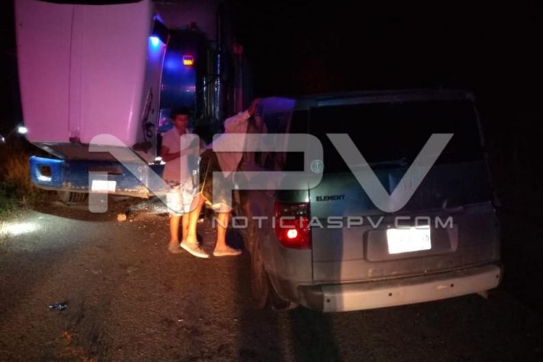 Fuerte accidente se registró por la carretera del camino viejo, en el tramo de Valle de Banderas a Bucerías, donde chocaron un tractocamión y una camioneta familiar, misma que quedó seriamente dañada, donde afortunadamente no hubo lesionados graves, pero sí cuantiosos daños materiales, tomando nota del accidente, los agentes de Tránsito Municipal de Bahía de Banderas.