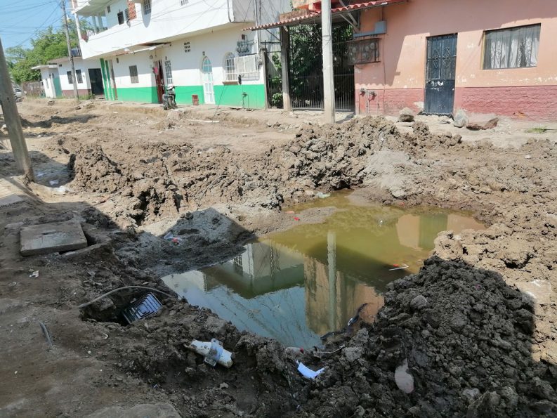 Se trata de la calle Amado Nervo donde desde mas de dos semanas la constructora contratada por Obras Públicas del Estado de Nayarit rompió drenaje que no se reparó y las aguas negras concentradas en un gran pozo comenzó a oxidarse con pestilencia insoportable para los vecinos
