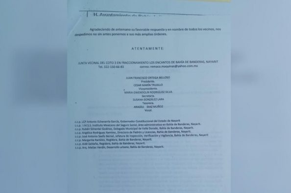 Pero, no solamente a esta dirección se han acercado los vecinos de este coto, también al presidente municipal, Jaime Cuevas, le hicieron llegar un oficio de queja y solicitud, al área administrativa del IMSS, al delegado de Valle Dorado, a la dirección de Padrón y Licencias en el área de inspección, verificación y vigilancia, a tránsito municipal y a dos regidoras, una de ellas la de esta demarcación de Mezcales.