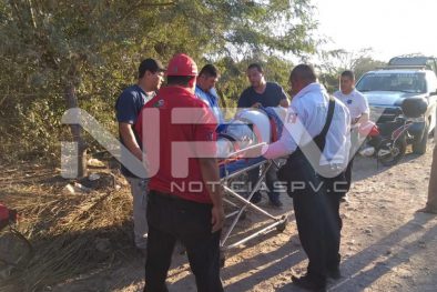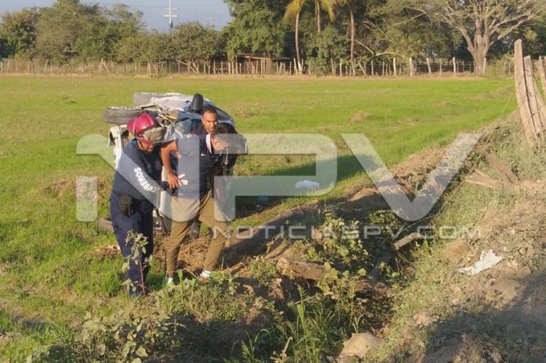 Dos personas lesionadas y cuantiosos daños materiales, fue el saldo de un fuerte accidente ocurrido en San Juan de Abajo, donde un maestro de la secundaria arrolló con su auto a un motociclista, luego paró su loca carrera dentro de un potrero, donde quedó con las llantas hacia arriba.