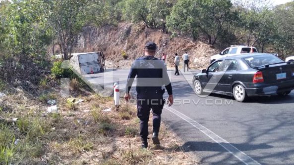 Este jueves se registró la volcadura de un trailer cargado de pollo fresco que iba con rumbo a Puerto Vallarta, proveniente de Lagos de Moreno, el cual no alcanzó a llegar a su destino debido a que el conductor perdió el control en una peligrosa curva y terminó volcando donde afectó también la circulación de los demás vehiculos al quedar cerrada momentáneamente la carretera.