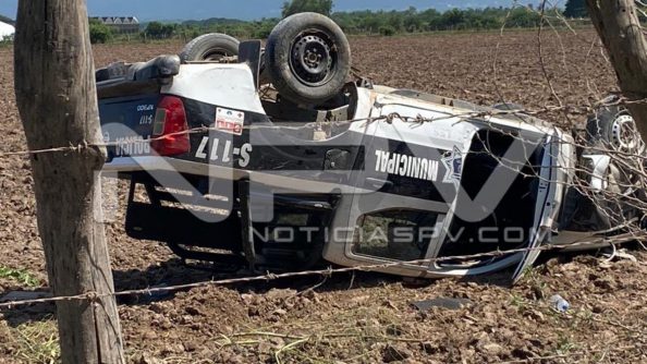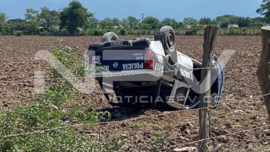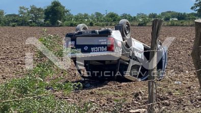 Fue por la brecha que conduce de San Vicente a Jarretaderas donde terminó volcada la unidad policíaca dentro de un potrero luego de que su conductor perdió el control