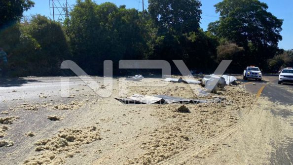Según primeros reportes indican que el remolque de un camión doblemente articulado, se desprendió terminando por volcar en varias ocasiones abriéndose completamente y tirando la melaza.