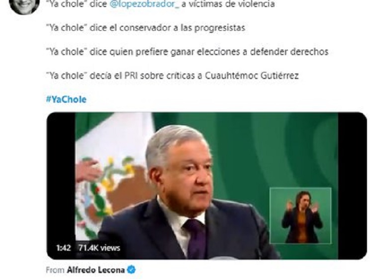 La politóloga y escritora Denise Dresser, mecionó que “ya chole dice el presidente Andrés Manuél López Obrador. “Ya chole” dice el conservador a las progresistas. “Ya chole” dice quien prefiere ganar elecciones a defender derechos. “Ya chole” decía el PRI sobre críticas a Cuauhtémoc Gutiérrez. #YaChole.”