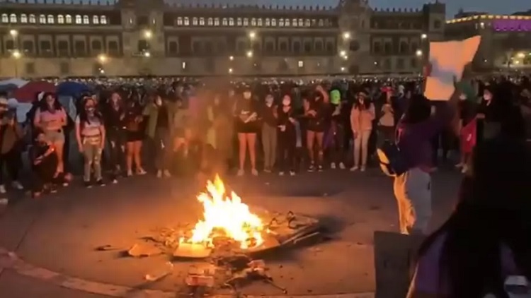 Alrededor de las 18:00 horas, cientos de feministas y mujeres en general prendieron una fogata al pie del asta de la bandera en la plancha del Zócalo capitalino, donde se reunieron para cantar juntas y lanzar consignas.