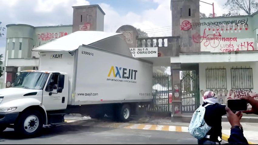 A 11 años de Ayotzinapa: Normalistas tiran puerta del Campo Militar 1 con un camión y lanzan explosivos