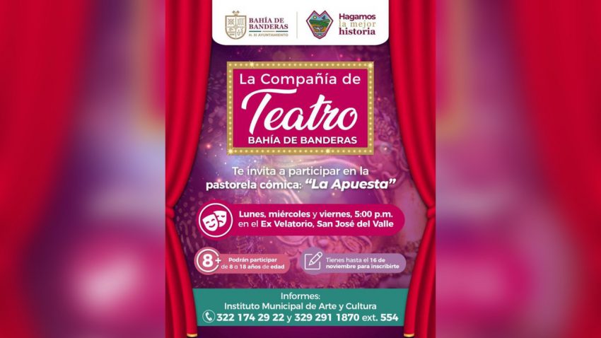 Bahía de Banderas, Nay., 9 de noviembre de 2022.- La Compañía de Teatro de Bahía de Banderas invita a niños y adolescentes, entre ocho y 18 años. a participar en el montaje de la pastorela cómica «La Apuesta». La intención primordial es llevar esta puesta en escena varias de las poblaciones del municipio durante la temporada decembrina.